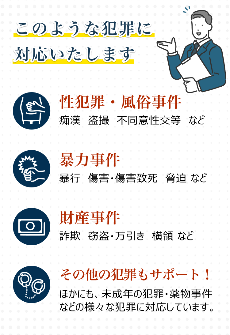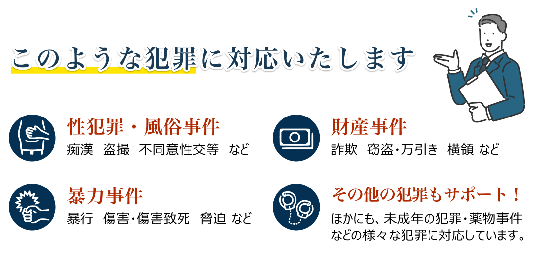 痴漢や盗撮をはじめとする性犯罪から、傷害、横領、詐欺、DV、窃盗、交通事故、薬物事件、裁判員裁判対象事件など、刑事弁護専門チームが幅広い犯罪に対応し豊富な実績があります。
