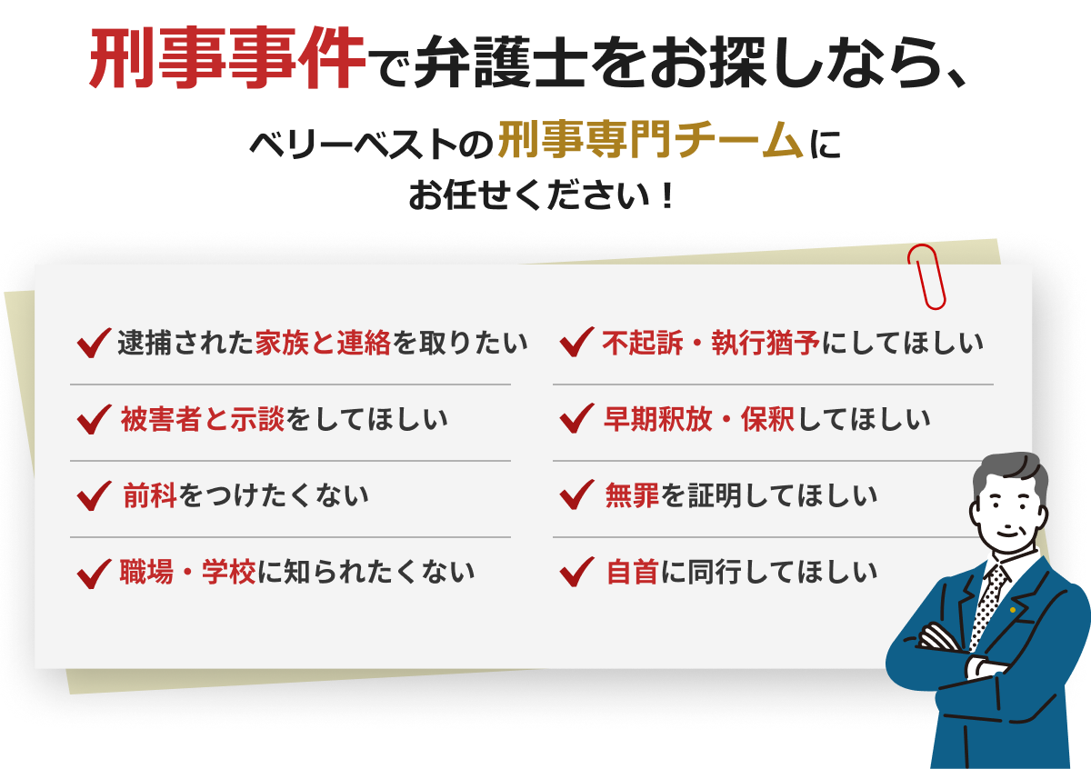 ベリーベスト法律事務所には若佐一朗弁護士をはじめ元検事の弁護士が7名在籍しており(※)、刑事事件専門チームに元検事のノウハウを共有しています。そのため、裁判前の弁護活動であれば、検事から不 起訴処分を勝ち取るためには、どのようなポイントを押さえて弁護活動を行えばいいかを熟知しております。
